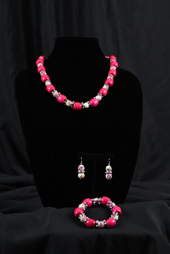 22″ Wood and Ceramic 3 Piece Necklace Set:  Necklace, Earrings and Bracelet