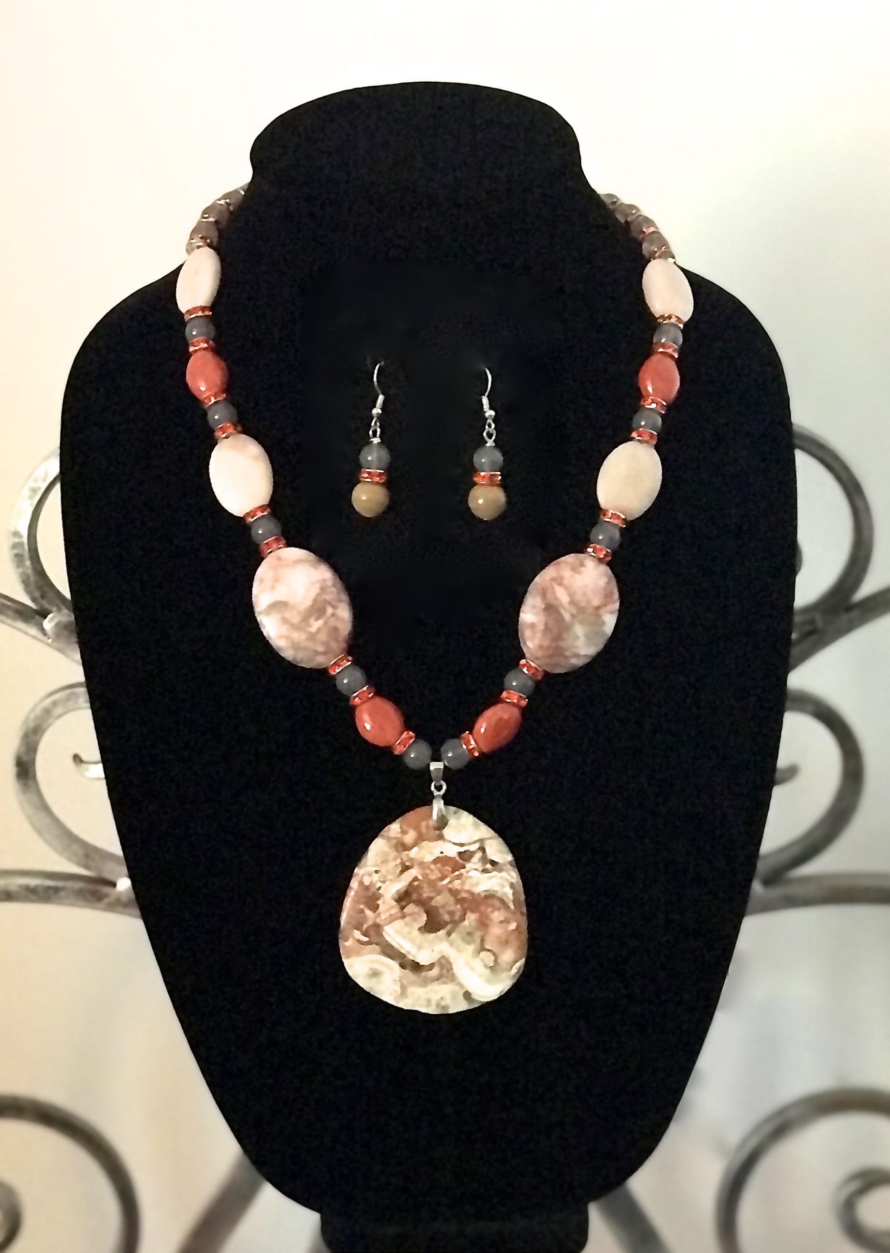 21″ Necklace of Stone and Glass Beads with Matching Earrings