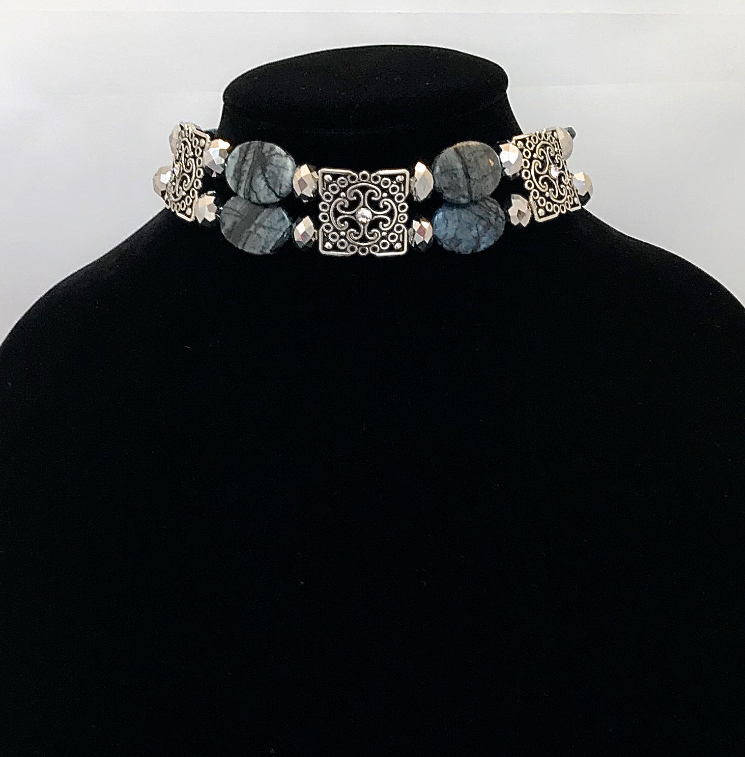 Choker ~ Silver Pendants w/Grayish/blueish Agates and Faceted Glass Beads