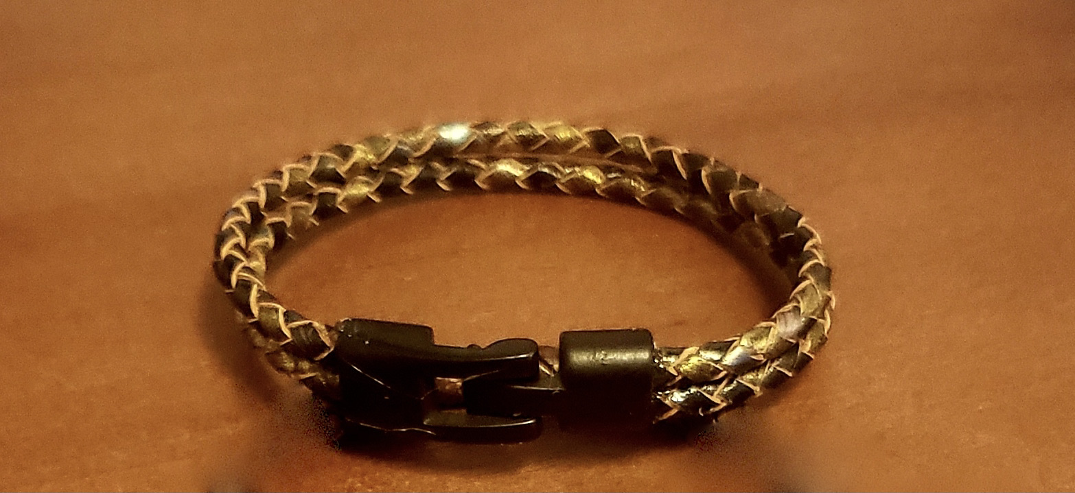 8″ 4mm Bolo Braided Leather Cord Black Mosaic double strand bracelet with interlocking black enamel hook clasp.