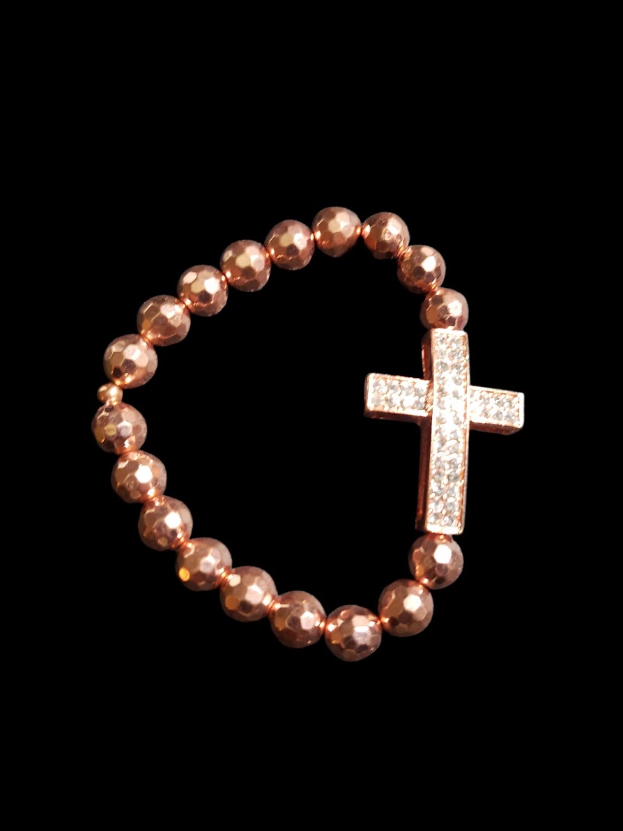 Rose Gold Metal Bracelet with Rose Gold and Rhinestone Crusted Cross