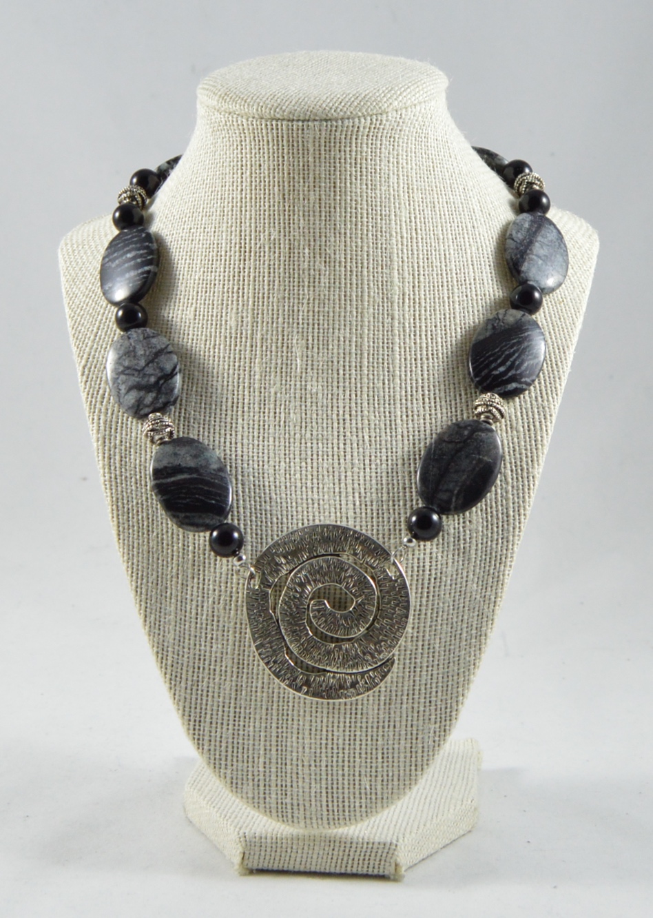22″ Necklace with Stone and Glass Beads and Silver Pendant
