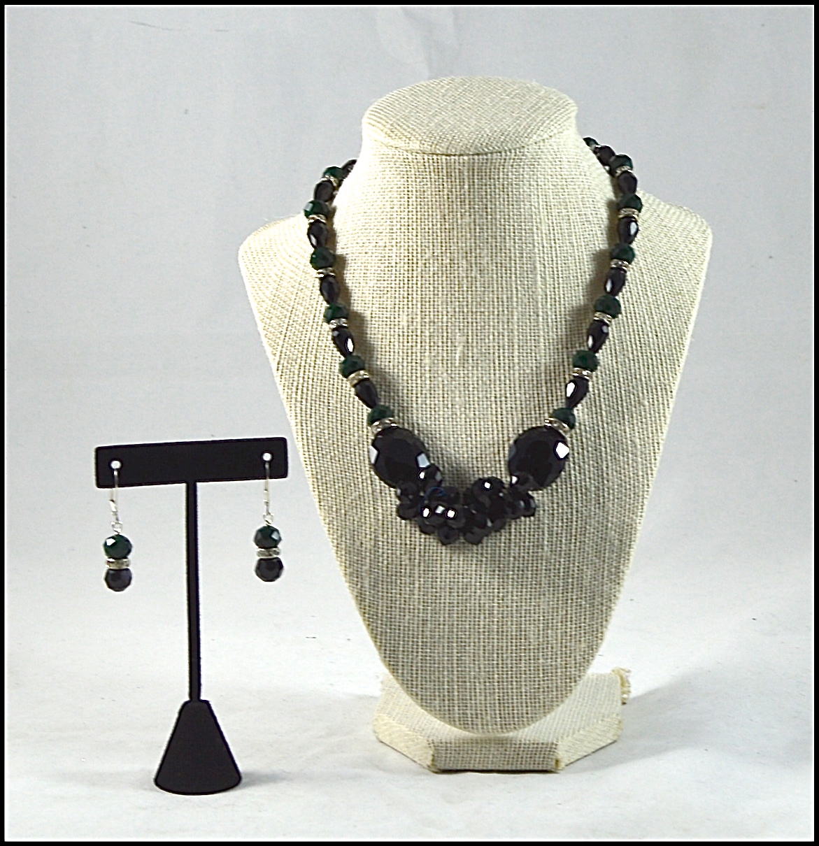 18” Multiple Faceted Black and Green Glass Beads with Rhinestone Roundels Accents and Matching Earrings